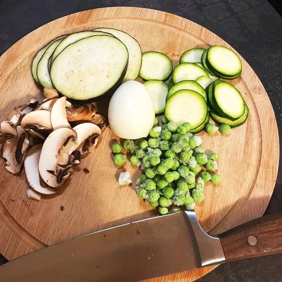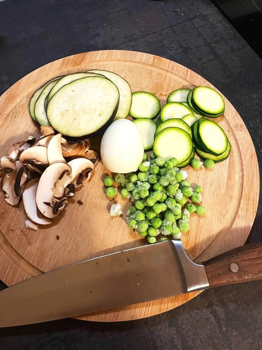 Today it is eggplant, zucchini, mushrooms, frozen peas, and a boiled egg; I am preparing everything so I can assemble the lasagne easily (it’s like playing a good old game of Tetris).